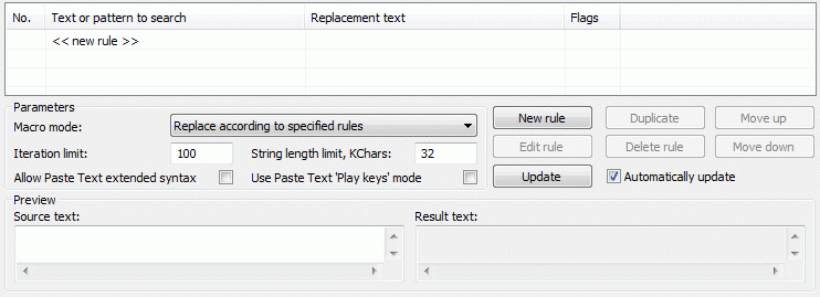 Result text shows the result text after all transformations. It can be updated automatically (if you check the Automatically update box) soon after you modify the source text or change a rule. Otherwise it must be updated manually by clicking the Update button.