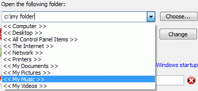 Folder to open enter the path to the folder you wish to open or select the folder using the "Browse" button. Click on the down button at the right of the input field to choose from standard folders