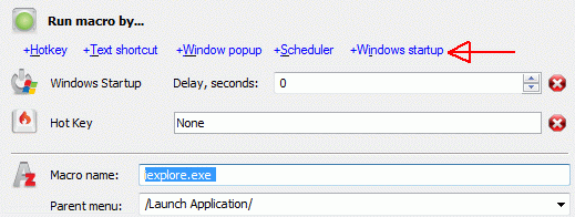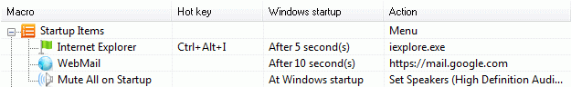 Honestly speaking, Hot Keyboard launches macros not exactly on Windows Startup, but on its first start until the user log off. It is possible to set up a delay in seconds to launch macros later