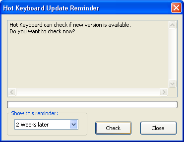 This reminder screen can automatically pop up after a desired period of time. You can choose how often Hot Keyboard will remind you in the "Show this reminder" field. Setting this to "Never" will prevent Hot Keyboard from showing this reminder. But you can bring this dialog out anytime you want by selecting the "Help" -> "Check for updates" menu item in the main Hot Keyboard window.