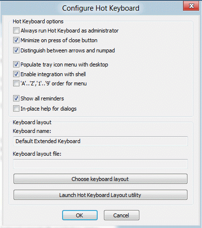 Always run Hot Keyboard as administrator - This option is available under Windows Vista and above only and tells Hot Keyboard to request administrative permissions on startup.