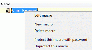 There are two ways to protect a macro. You can check the Protect this macro with password box while editing the macro, or select a macro in the macro tree, click the right mouse button to open pop-up menu and select the Protect this macro with password menu item.