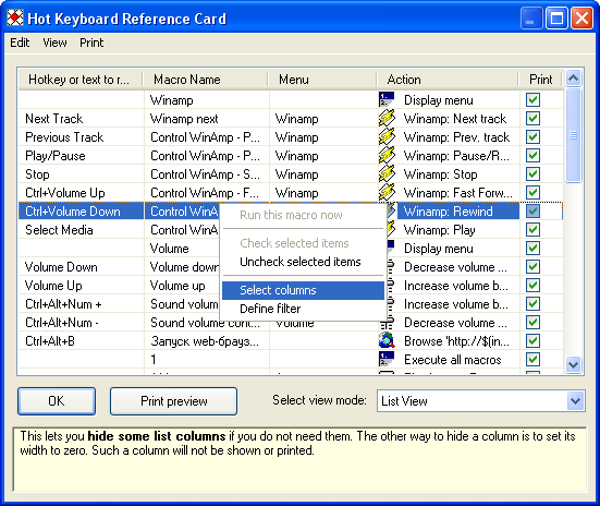 List View mode is the main Reference Card view mode. In this mode all macros are displayed in the form of a list with up to 5 columns - that is exactly how they will be printed. You can select which columns are to be displayed by clicking the "View" -> "Select columns" menu item or the corresponding popup menu item.