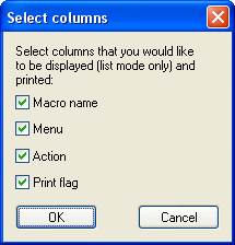 The check mark in the "Print" column defines which macros are to be printed when you select the "Print" menu item. You can check or uncheck all visible macros by selecting the "Edit" -> "Check all" or "Edit" -> "Uncheck all" menu items correspondingly. Also, you can select some macros in the list and then check or uncheck them by selecting the corresponding popup menu item ("Check selected macros" and "Uncheck selected macros").