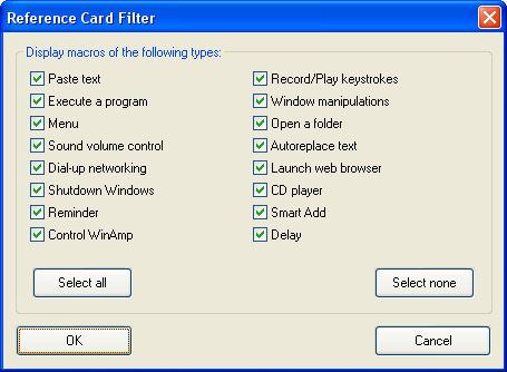Hot Keyboard Reference Card gives you a listing of all your defined macros and allows you to print some or all of them on a printer. It is accessed from the "Help" menu in the main Hot Keyboard dialog or by a hotkey assigned in the Options dialog. When Reference Card is called by its hotkey, it is possible to run a macro by double clicking on it or by selecting the corresponding popup menu item.
