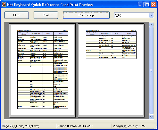 You can look at the print preview of the Hot Keyboard Reference Card before actually printing it. This can be done by clicking the "Print preview" button or selecting the "Print" -> "Print preview" menu item. You will see the next dialog: