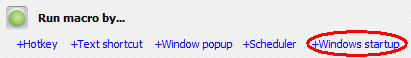 To run macro on startup, go to Run macro by... section in the macro editor and click +Windows Startup: